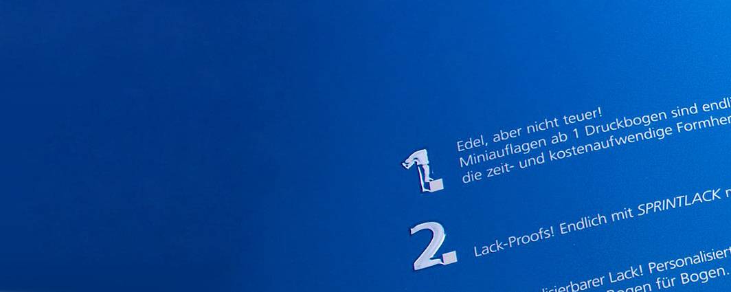 Digitaler UV-Lack (Sprintlack) ist besonders in Kombination mit Folienkaschierung geeignet. Bezüglich der Lackierbarkeit von digitalgedruckten Bogen bitten wir um vorherige Absprache. Silikonhaltige Tonersysteme sind aufgrund zu geringer Oberflächenspannung nicht geeignet.